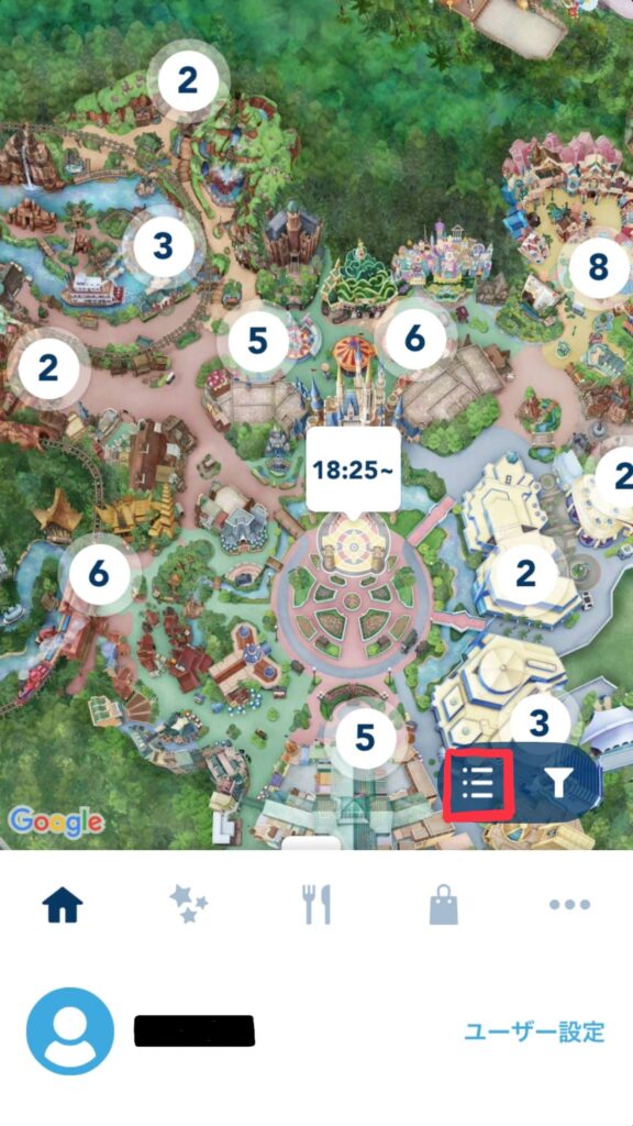 三本線のアイコンを押すことでエリアごとのアトラクションの待ち時間を確認することも出来ます。