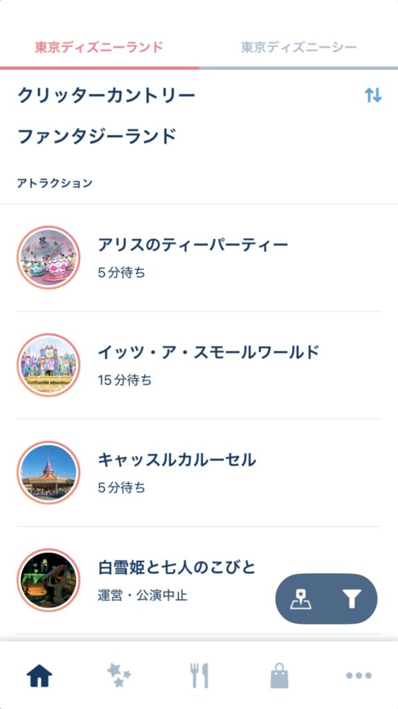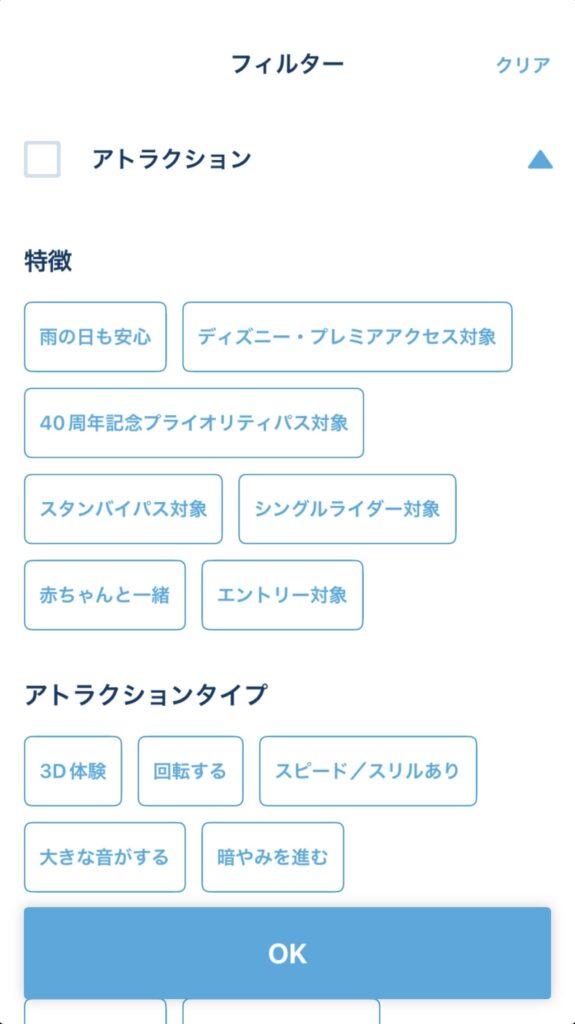 フィルターのアイコンはアトラクションを条件で絞ることができます。