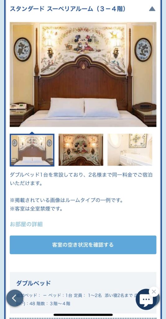 部屋の詳細を確認し、問題なければ「客室の空き状況を確認する」を選択し次に進みます。