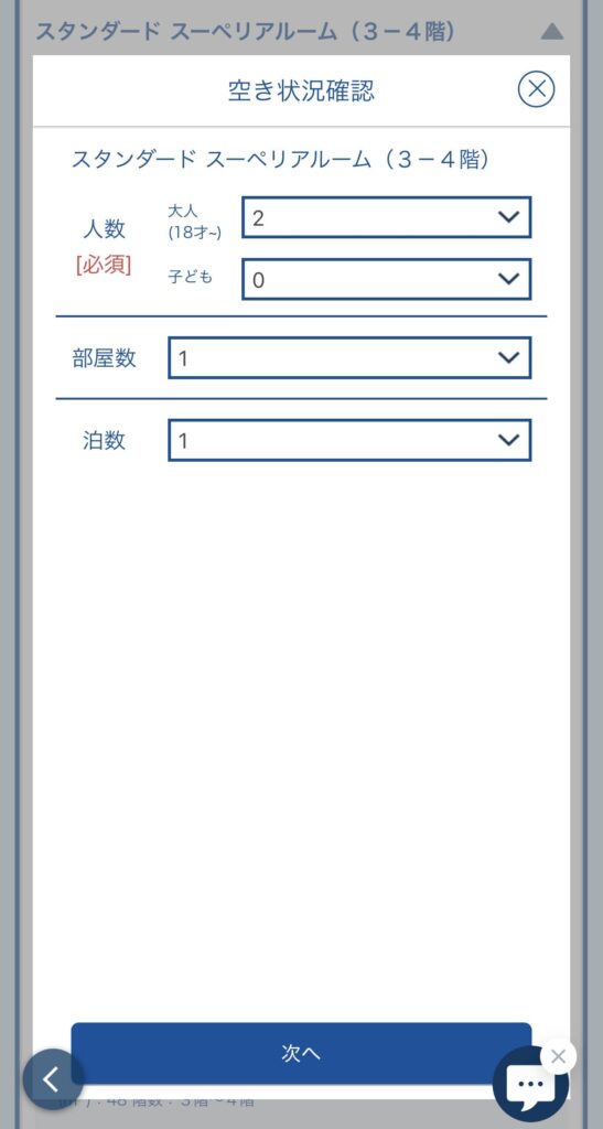 宿泊する人数部屋数拍数を選択し、次へを押すと予約可能かが確認できます。
