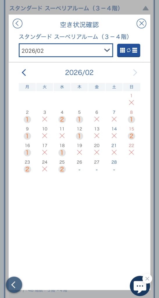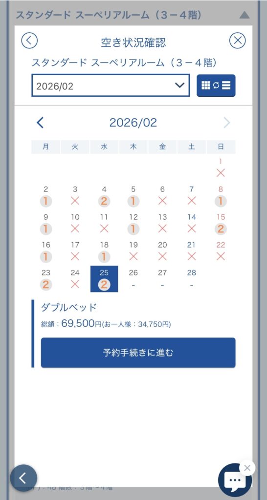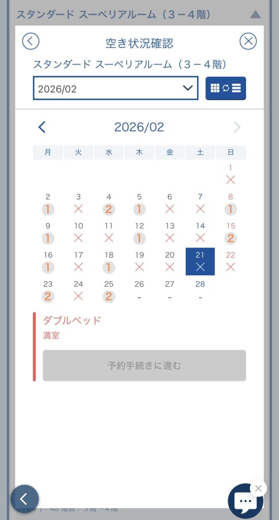 ✖️印は予約に進むことができません。他の日にちや他のホテルを選択しましょう。