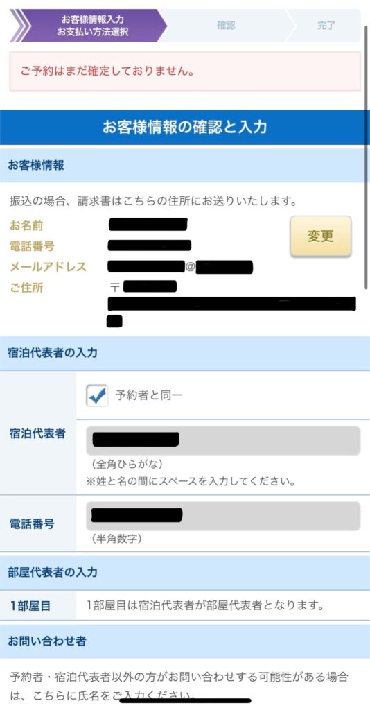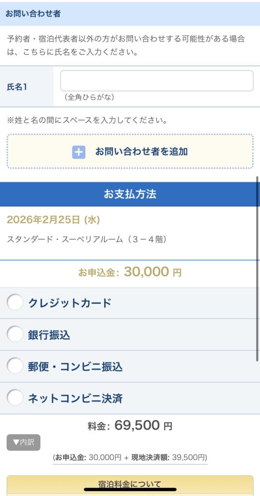 次に宿泊者の情報の入力とお申込金の支払い方法を選択します。